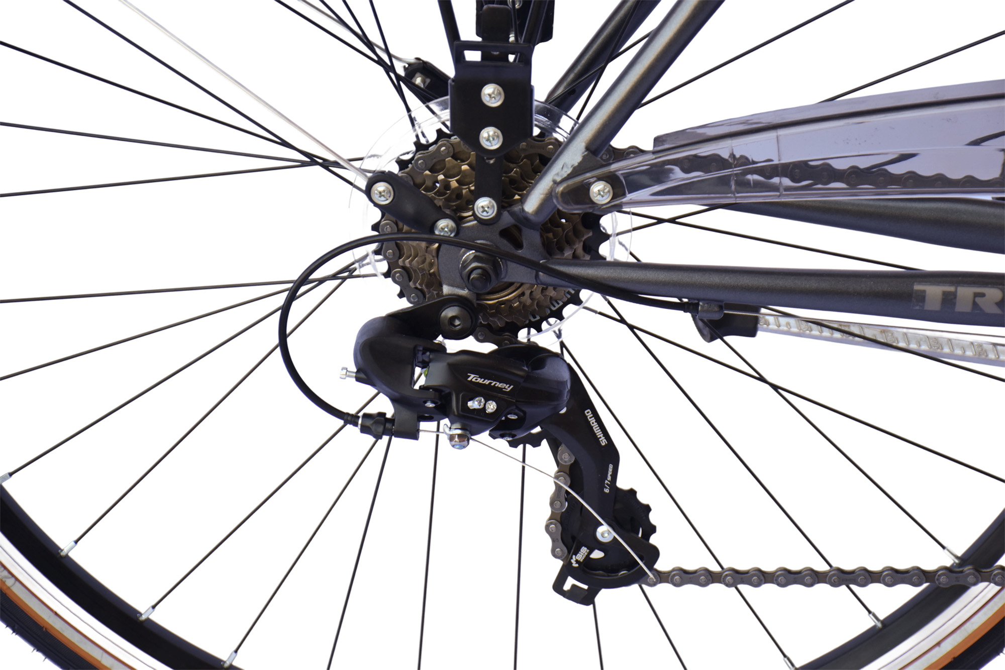 Die Shimano Tourney Schaltung mit leicht bedienbarem Drehgriff sorgt für müheloses Schalten. Mit insgesamt 21 Gängen ist das Damen-Trekkingrad bestens geeignet für flaches Gelände ebenso wie für kleine Anstiege.